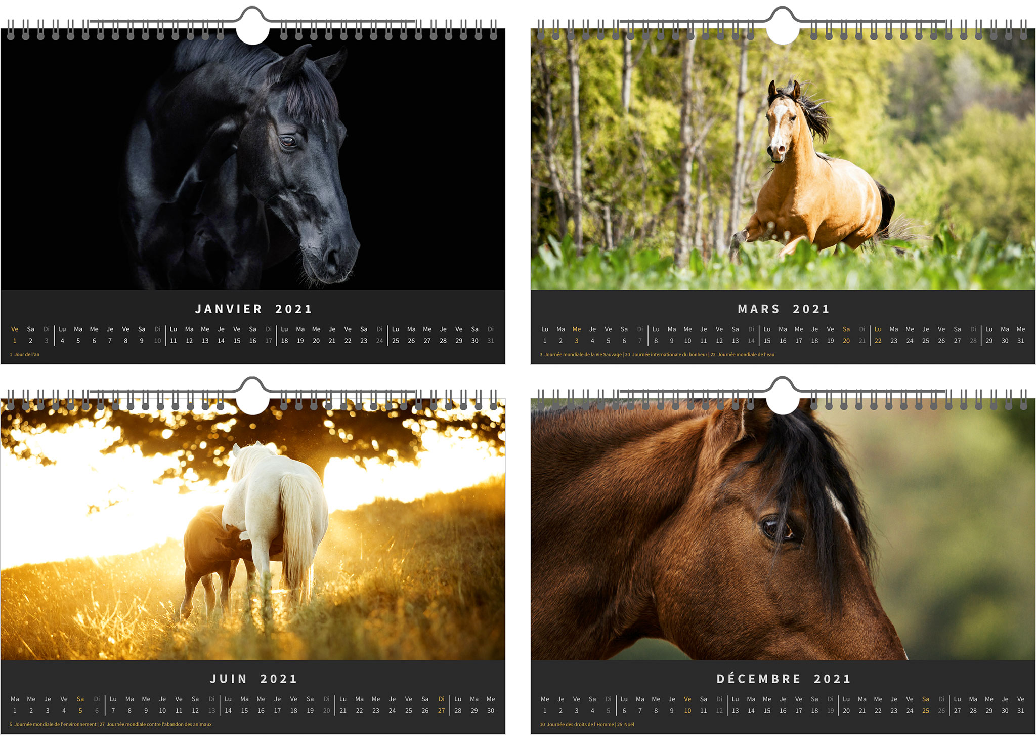 Bon, parlons des photos maintenant ! Je suis remontée jusqu’en 2017 pour sélectionner mes photos préférées, tout en faisant attention à proposer de la diversité, et une cohérence avec le mois de l’année. Elles représentent toutes des chevaux en liberté, parfois sur fond noir, parfois en mouvement, parfois dans le calme, et quelques gros plans.
